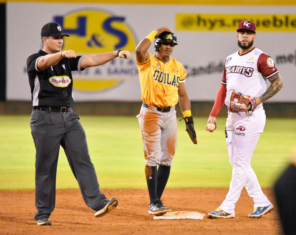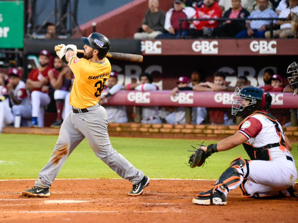 La ventaja amarilla se consolidó en el séptimo inning ante los envíos de Reymin Guduan. Tras un sencillo de Elih Marrero y un boleto a Steward Berroa, ambos avanzaron con un lanzamiento desviado. Un sencillo al cuadro de Leody Taveras remolcó a ambos para poner el marcador 5-3.
