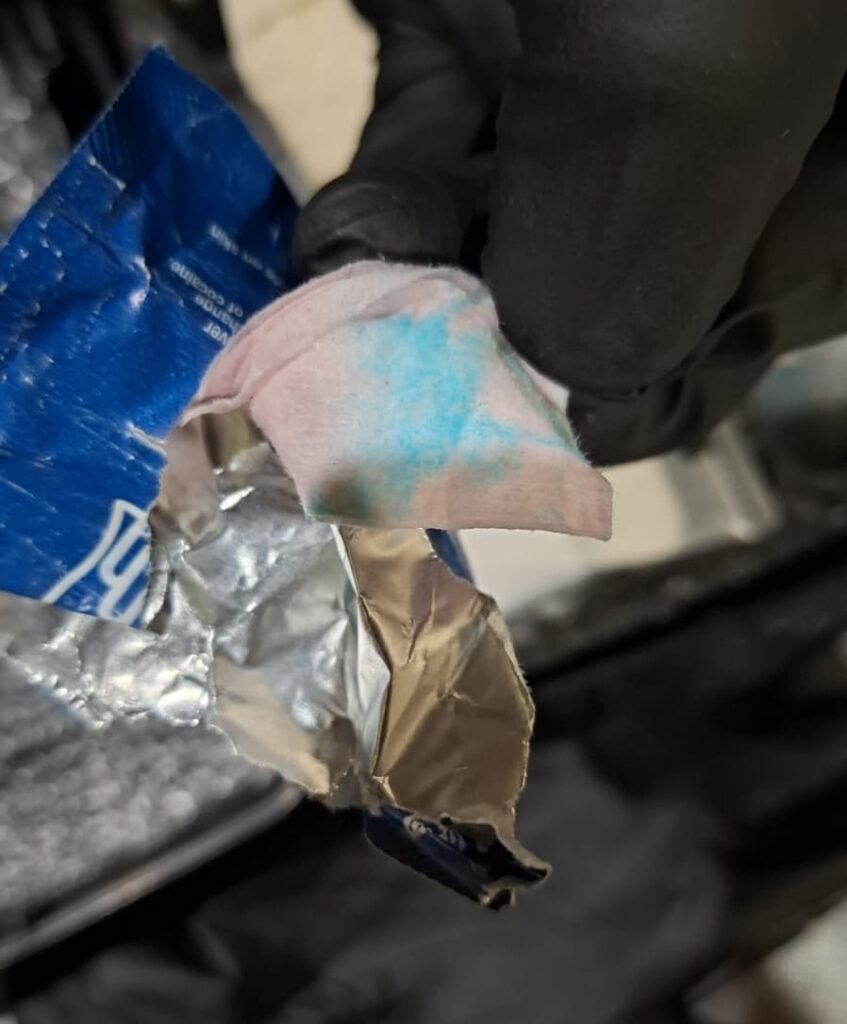 “En el interior del equipaje se incautaron 12 franelas, 53 poloshirt, 09 pares de medias, (18 unidades), 15 abrigos, 02 toallas, 01 pantaloncillo, 01 sabana, 05 unidades de ropa para bebe y 04 pantalones; cabe destacar que las unidades actuantes eligieron al azar una de las prendas, la cual al ser sometida a una prueba de campo, arrojó positivo a cocaína”