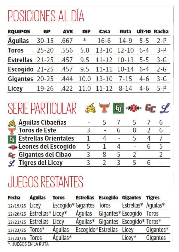 Las últimas cinco fechas de la serie regular encuentran cómodas a las Águilas Cibaeñas y a los Toros del Este. El resto deberá remar con estrategia y energía si quiere avanzar a la postemporada.