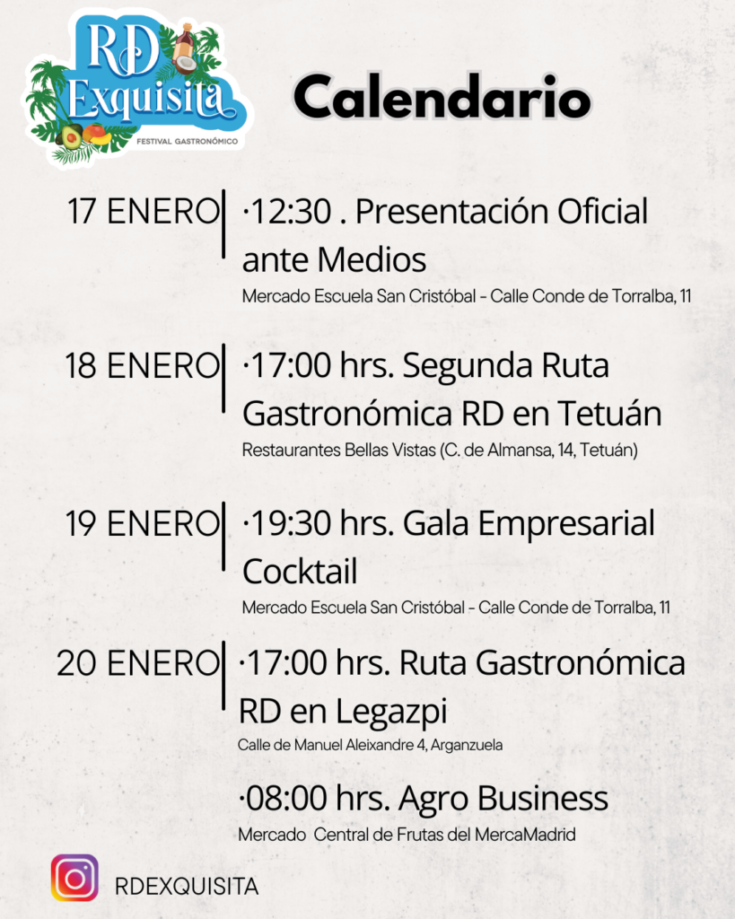 El festival gastronómico «RD Exquisita 2026» llega a Madrid este enero con una agenda cargada de eventos que celebran la riqueza culinaria y cultural dominicana en tierra española, teniendo una especial dedicatoria a la reconocida chef dominicana Inés Páez Nin(Tita).
