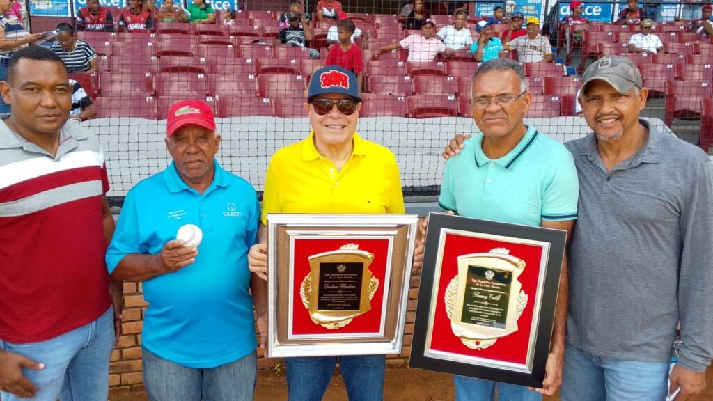 Santana Martínez y Amaury Castillo reciben placas de reconocimientos por sus valiosos aportes en favor del béisbol campesino de la provincia Duarte.