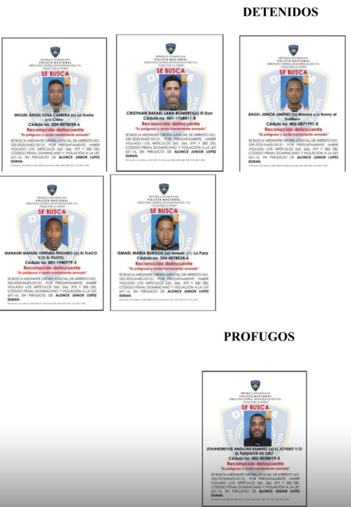 Los detenidos fueron identificados como Cristhian Rafael Lara Romero, alias “El Don”; Miguel Ángel Sosa Cabrera, alias “La Greña” y/o “Chino”; Ismael María Burgos, alias “La Para”; Ángel Junior Jiménez, alias “Moreno”; y Manauri Manuel Ventura Peguero, alias “El Flaco”, señalado como el cabecilla de la banda.