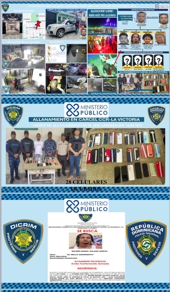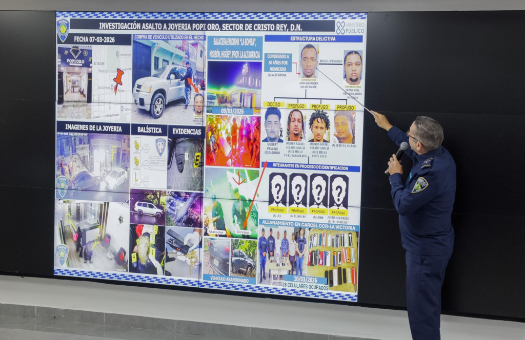 La Policía Nacional, en coordinación con el Ministerio Público, logró avances significativos en la investigación del asalto a mano armada perpetrado contra la joyería Popi Oro, ubicada en el sector Cristo Rey, Distrito Nacional, con la detención de dos de los presuntos autores, la identificación de otros implicados y la recolección de múltiples evidencias que fortalecen el proceso investigativo.