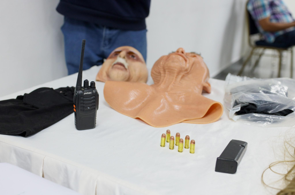 Asimismo, fueron colectadas 10 cadenas color amarillo, una radio de comunicación, siete exhibidores plásticos, tres máscaras con características de persona envejeciente, dos pasamontañas, una peluca de mujer color rubio, herramientas utilizadas para violentar el establecimiento, un cargador para pistola Glock calibre .40 con cápsulas, además de casquillos y otros elementos que forman parte de los análisis técnicos y periciales desarrollados por los organismos correspondientes.