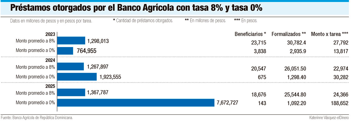 Por ejemplo, en 2024 el Bagrícola formalizó préstamos por RD$27,349.9 millones. De esa cantidad, RD$1,298.4 millones fueron a 0%. Tomando como referencia la cantidad de préstamos otorgados, los que tenía 8% de interés anual promediaron RD$1.2 millones, a razón de RD$22,974 por tarea. En tanto que los financiamientos a tasa cero fueron de un monto promedio de RD$1.9 millones por beneficiario, a razón de RD$30,282/tarea.