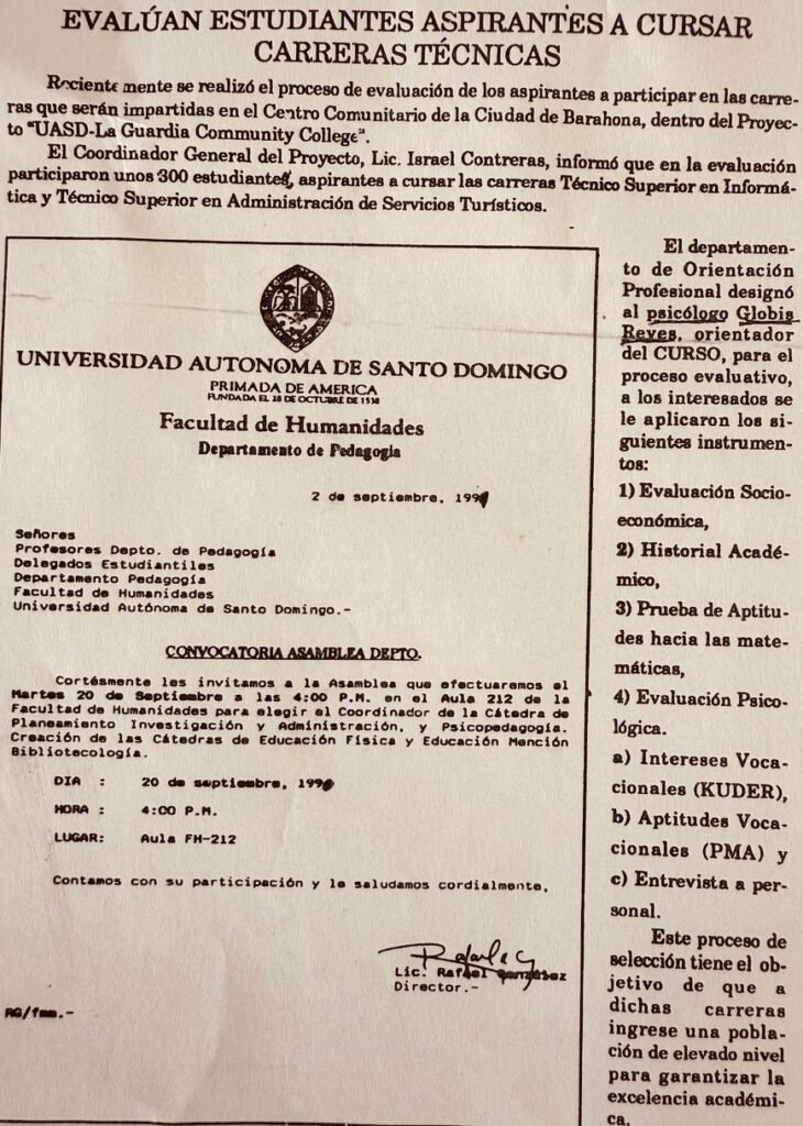 Le recuerdo cuando en el año 1994, se inició el proceso de evaluación de estudiantes de la Región Suroeste y otras regiones del marginadas del país que ansiaban realizar esas carreras técnicas, impartidas por el novedoso Centro Comunitario de la Ciudad de Barahona, dentro del “ PROYECTO UASD- LA GUARDIA COMMUNITY COLLEGE DE NEW YORK”.