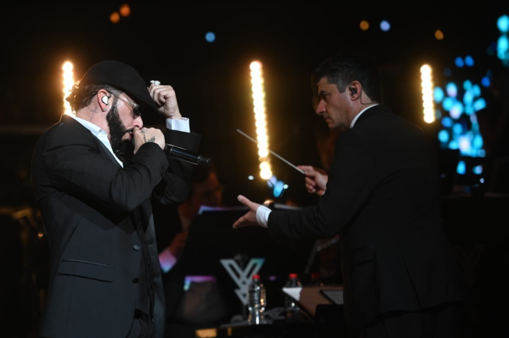 El reloj marcó las 9:30 de la noche cuando el artista salió al escenario vestido con un traje y una boina negra, acompañado de la Orquesta Sinfónica Nacional, dirigida por Javier Mendoza, director de orquesta mexicoamericano que se destaca por hacer colaboraciones sinfónicas con artistas urbanos.